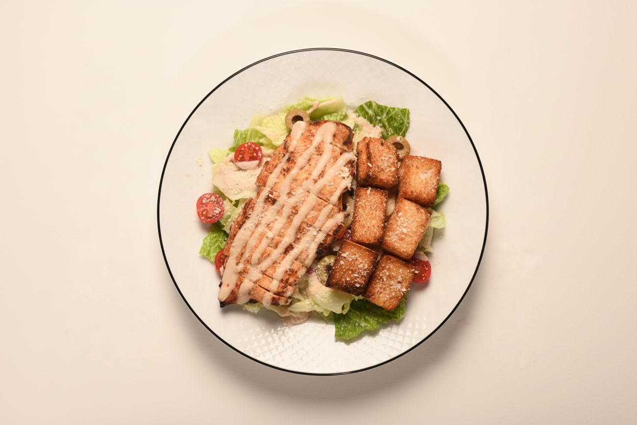 ۲ نفره، کاهوپیچ، سینه مرغ گریل شده، پنیر پارمسان، زیتون، گوجه گیلاسی، نان کروتان سیر، سس سزار