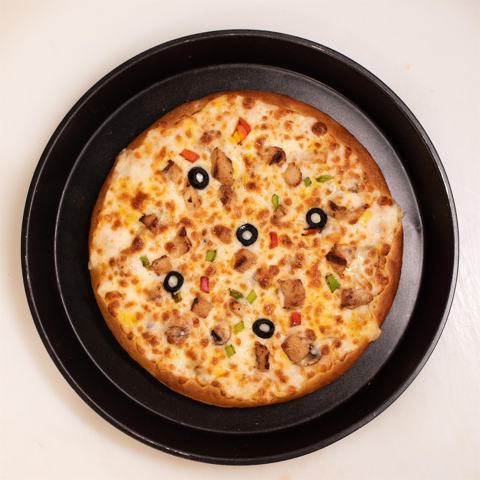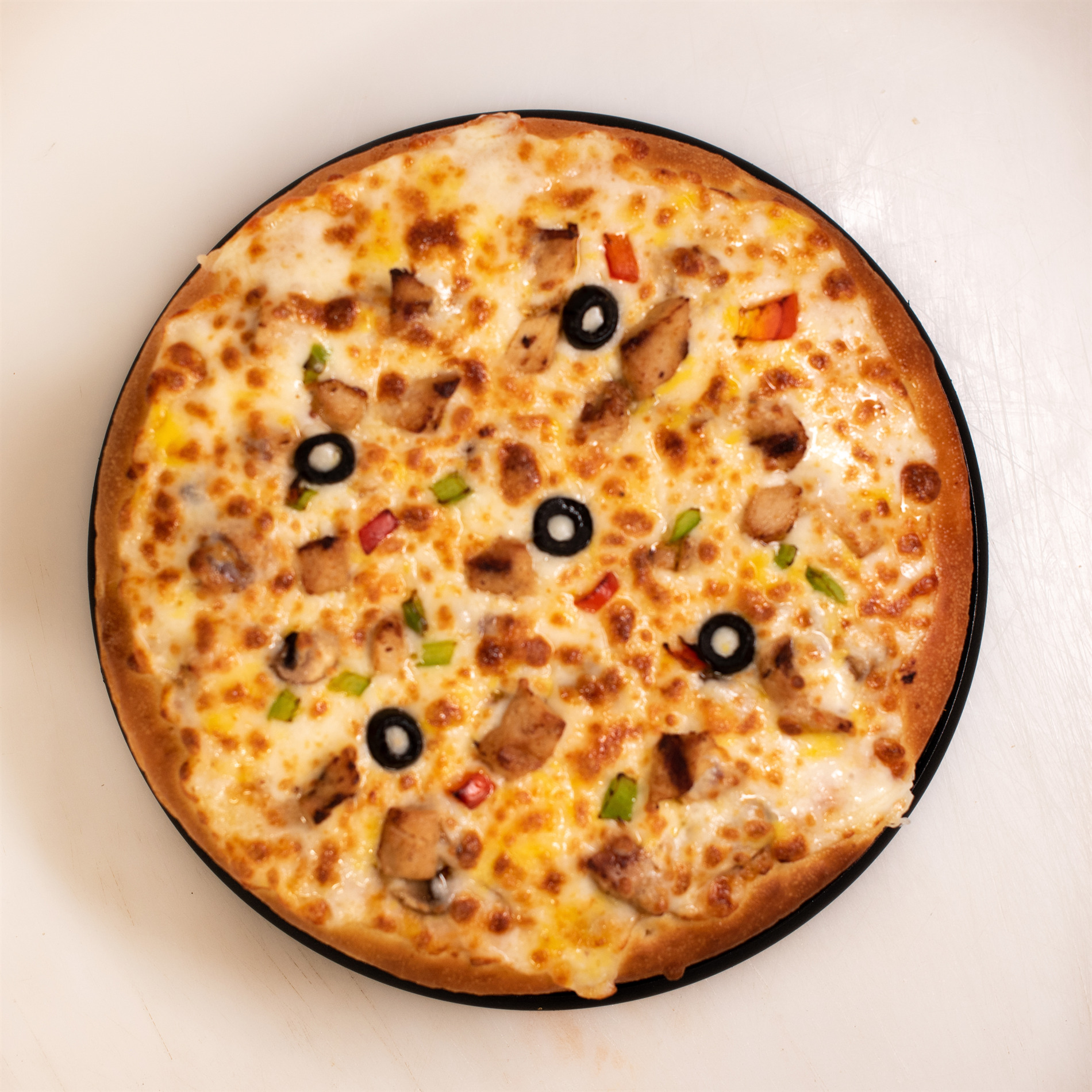 خمیر پیتزا کلاسیک، مرغ مزه دار شده، قارچ، زیتون سیاه، سس مخصوص آلفردو، فلفل دلمه رنگی، 4 نوع پنیر مخصوص