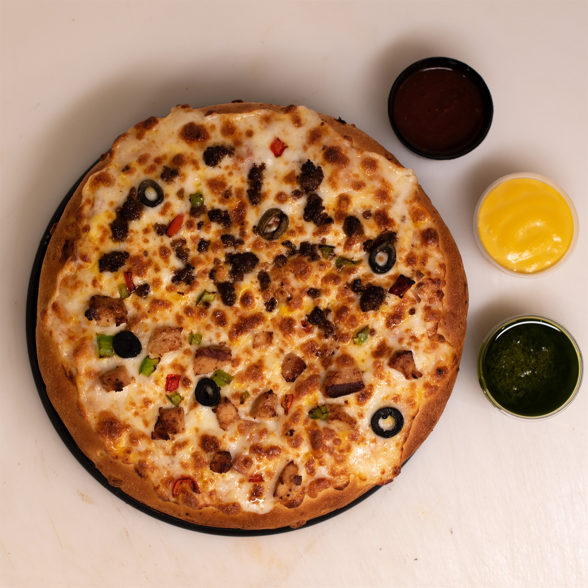 خمیر پیتزا، کلاسیک، مرغ مزه دار شده، قارچ، فلفل دلمه، زیتون سیاه، سس مخصوص باربیکیو، 4 نوع پنیر مخصوص