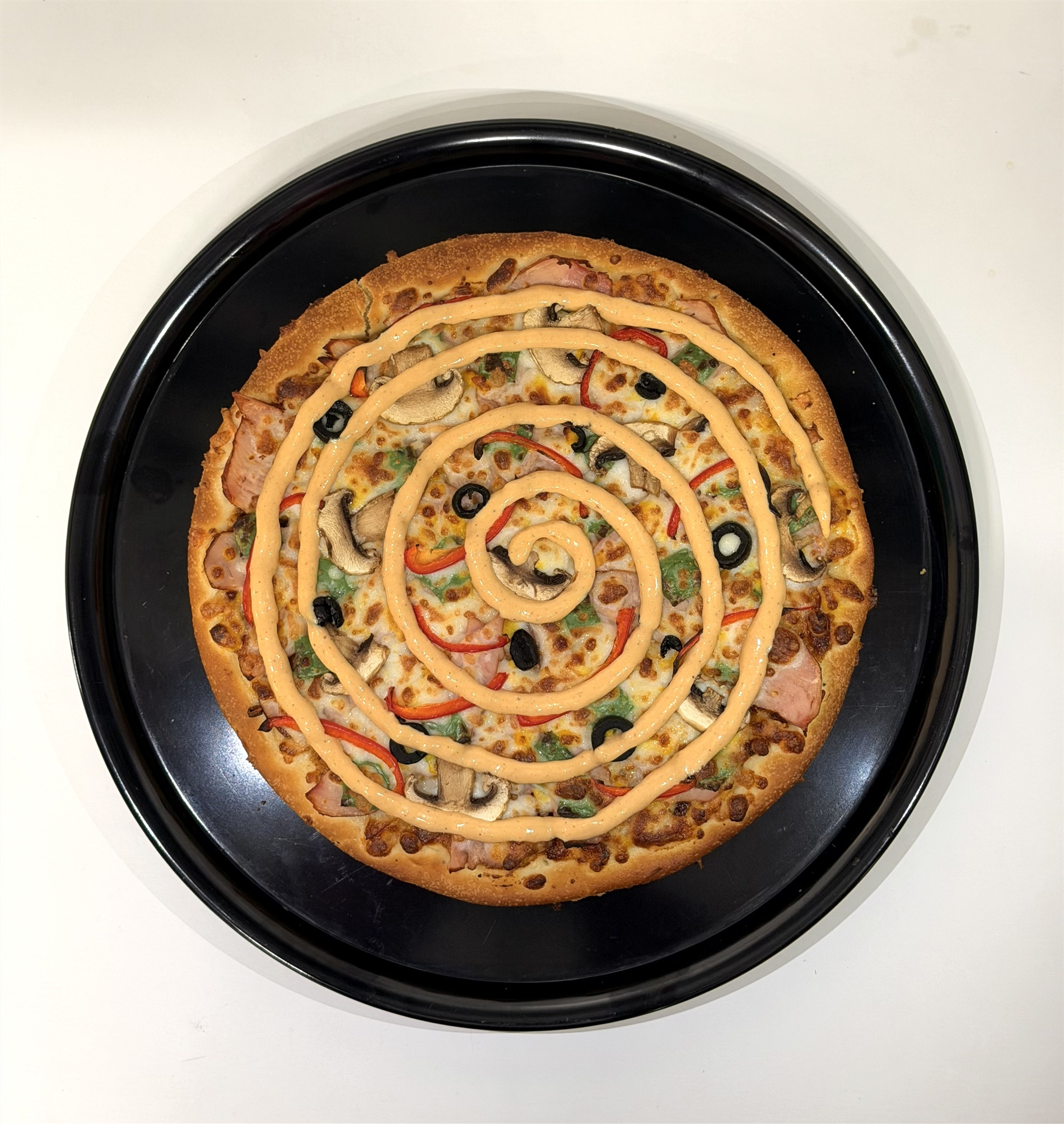 خمیر پیتزا، مخلوط ژامبون گوشت 70% و ژامبون مرغ 90%، قارچ، فلفل دلمه، زیتون، پنیر پیتزا