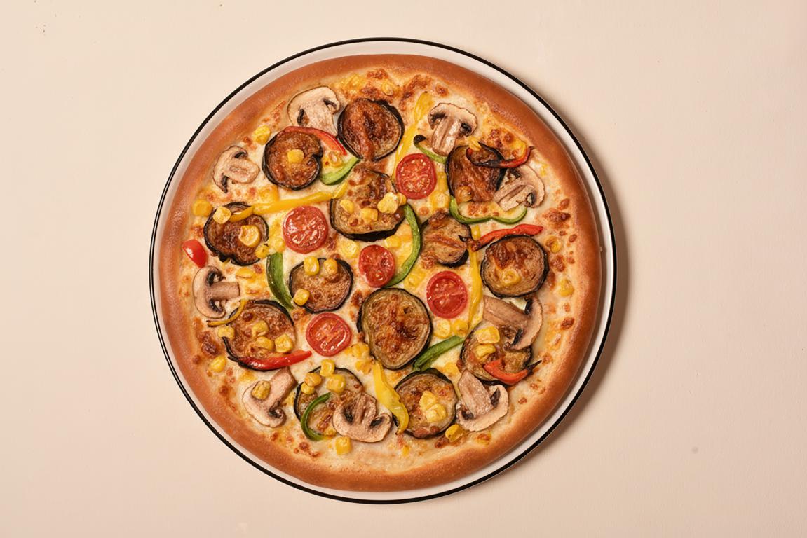 خمیر پیتزا کلاسیک قارچ، کدو، فلفل دلمه ای، زیتون، ذرت، گوجه، 4 نوع پنیر مخصوص